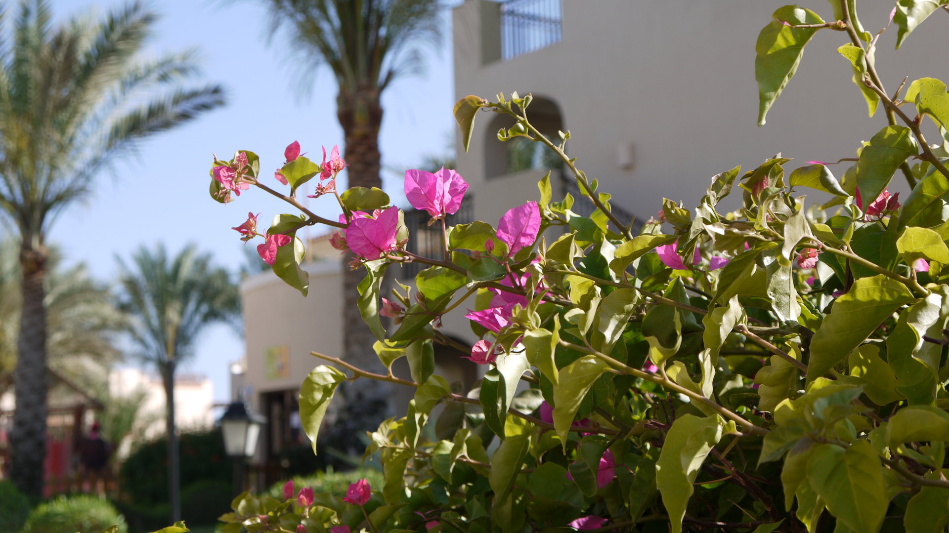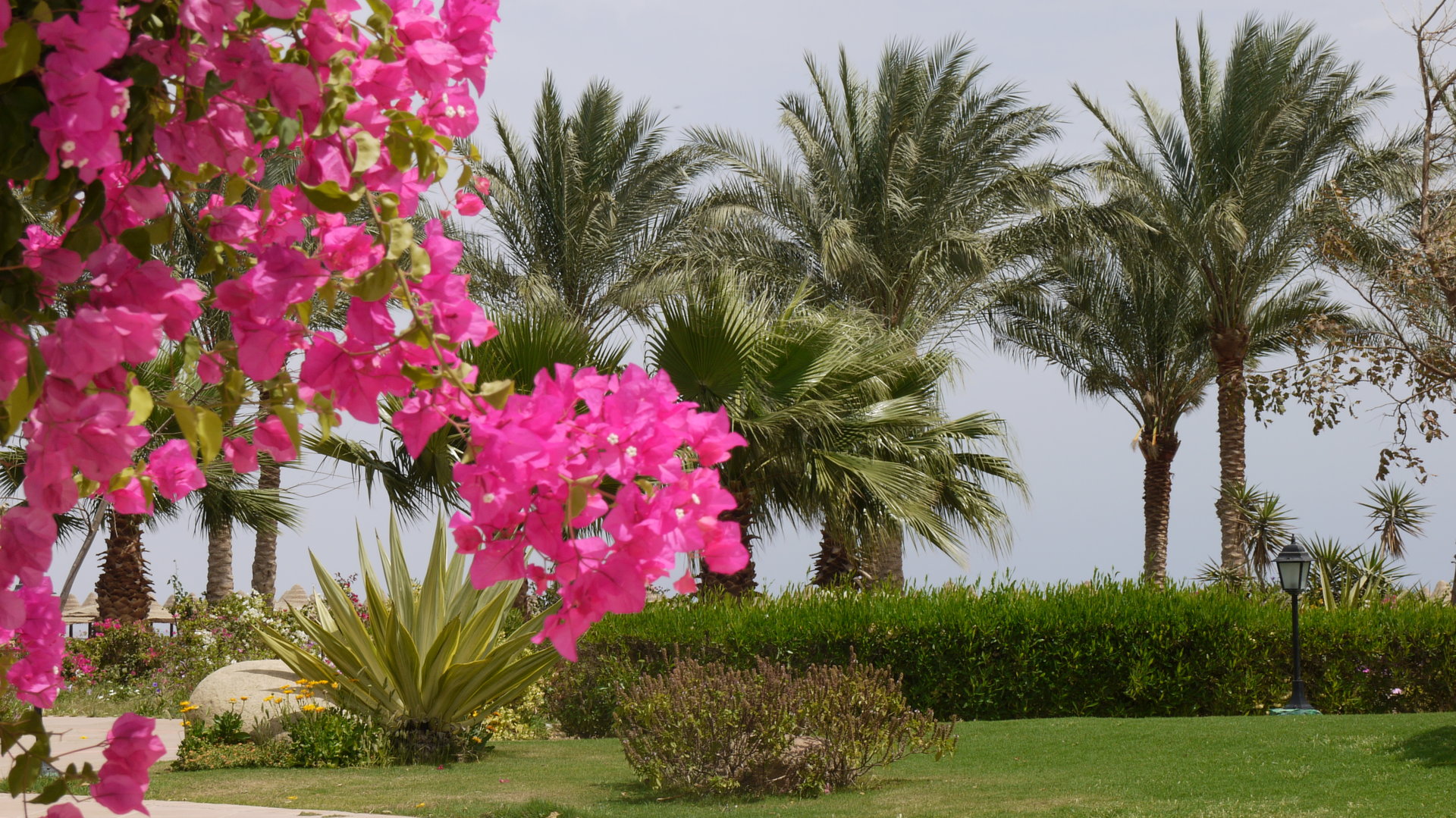 Территория не сказать чтобы очень большая, но вполне себе приличная. Пальмы, цветки, травка на должном уровне.